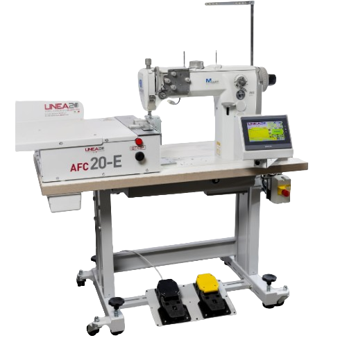 The AFC20-E stitching machine, in addition to its automatic system that generates stitching patterns based on just a few initial inputs, is equipped with the Linea20 presser foot, an essential component that ensures maximum material stability during the stitching process.